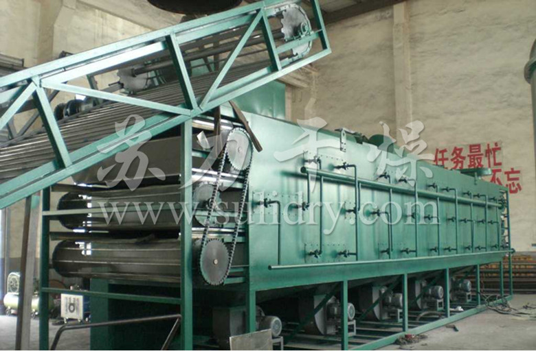 物料由加料器均匀地铺在网带上,网带一般采用12-60目不锈钢丝网,由传动装置拖动在干燥机内移动。干燥机由若干单元组成,每一单元热风独立循环,部分尾气由专门排湿风机排出,废气由调节阀控制,热气由下往上或由上往下穿过铺满物料的网带完成热量与质量传递的进程,带走物料水份。网带缓慢移动,运行速度可根据物料温度自由调节,干燥后的成品连续落入收料器中。上下循环单元根据用户需要可灵活配备,单元数量亦可根据需要选取。